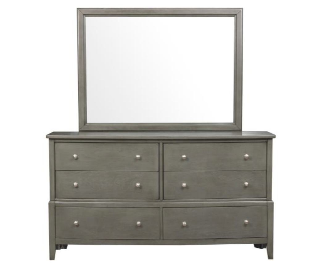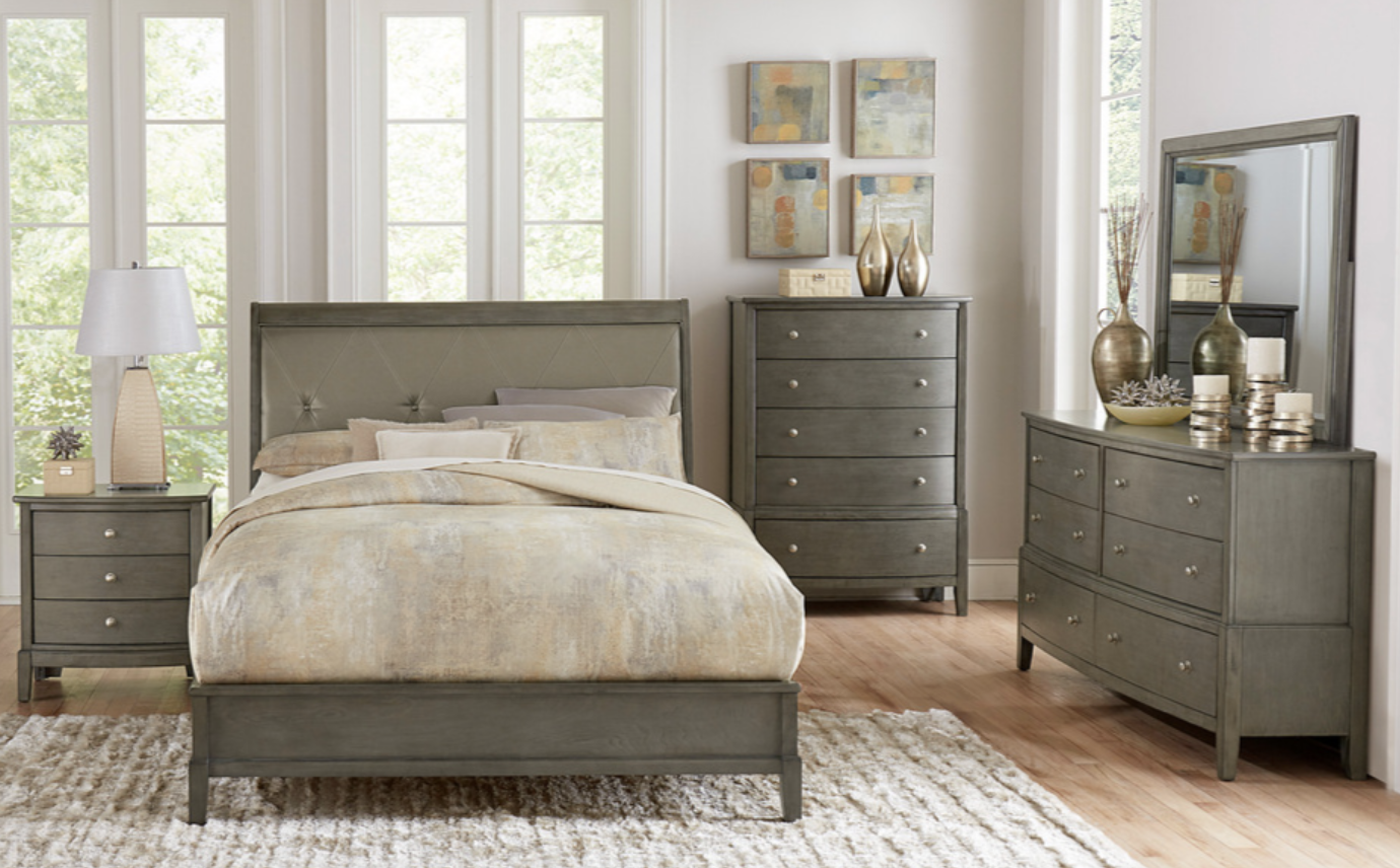 With transitional styling that is at home in a number of decorative environments, the Cotterill Collection will be a versatile addition to your bedroom. Gray finish over birch veneer, dramatically enhance the wood grain and is perfectly accented by the nickel hardware that punctuates each drawer front. Depending on your finish choice the headboard will feature either a black or gray faux leather insert with x-stitching and button-tufting.