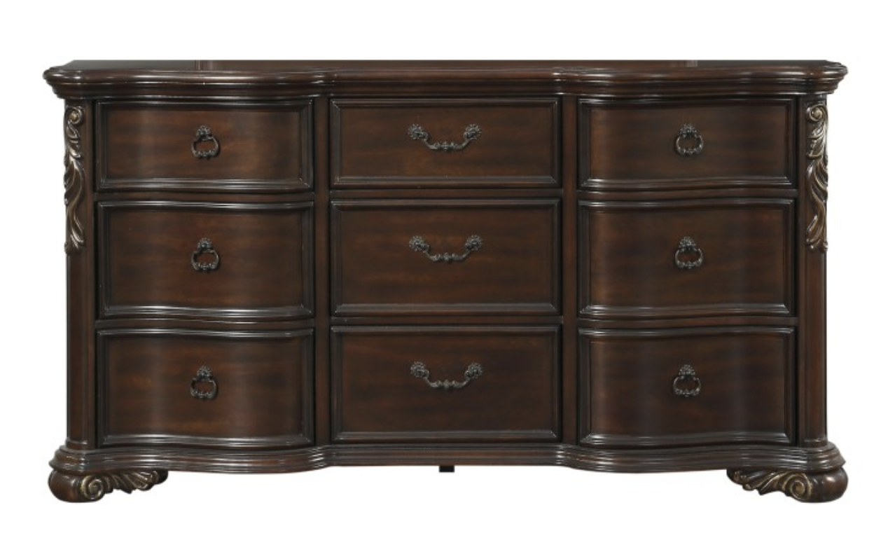 Grandly styled for the traditional home is the Royal Highlands Collection. Prominent decorative scrolling adorns the headboard while heavier, carved scrolling accents the pilasters and feet of each piece in the collection. The substantial wood framing of the bed creates a distinct serpentine profile that carries into the design of the case pieces. Brown faux leather provides complementing contrast to the rich cherry finish. Traditional cherry and birch veneers accenting furthers the elegant presentation of the Royal Highlands Collection.