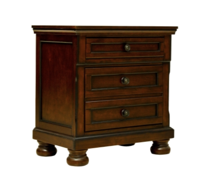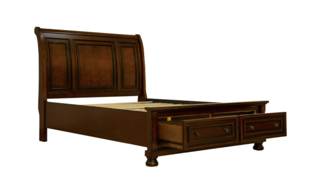 Casual transitional styling lends versatility to the placement of the Begonia Collection in a number of bedroom settings. The brown cherry finish lends distinctly to the execution of different looks from traditional to country casual, with knob hardware punctuating the look of each framed drawer front. Hidden drawers in the nightstand and dresser provide discrete storage for your valuables, while the storage drawers of the footboard provide a more visible means of additional storage capability. Bun feet support the case goods and a sleigh headboard finish off the transitional design of the collection.
