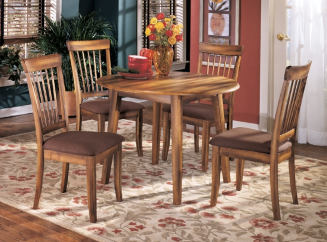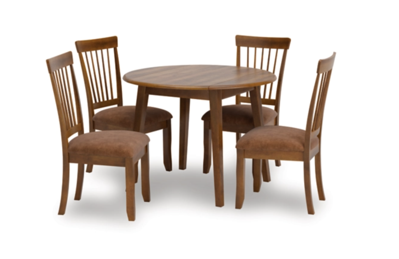 This versatile 5-piece dining room set incorporates decidedly rustic flair. The table’s two drop leaves provide just enough table space to accommodate the drop-in guest. Simple and clean lined, with stylish stilted legs, it’s a look that easily fits, whether your aesthetic is vintage, country or traditional. Upholstered side chair has a classic spindle back and seat covered in easy-to-maintain microfiber.