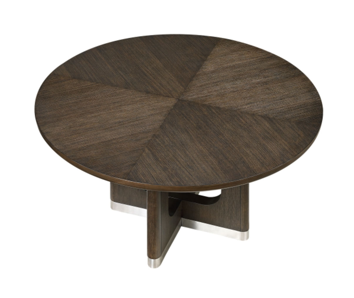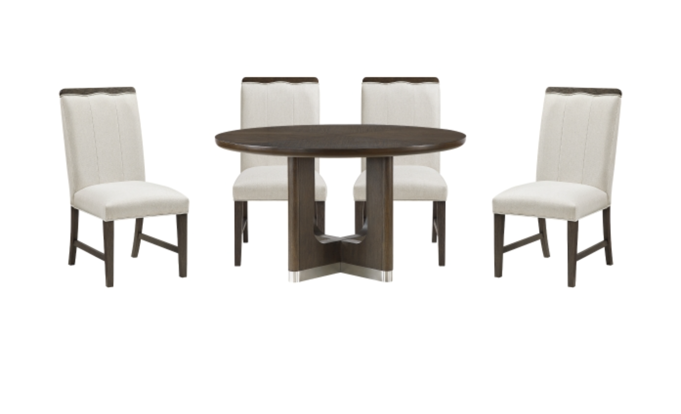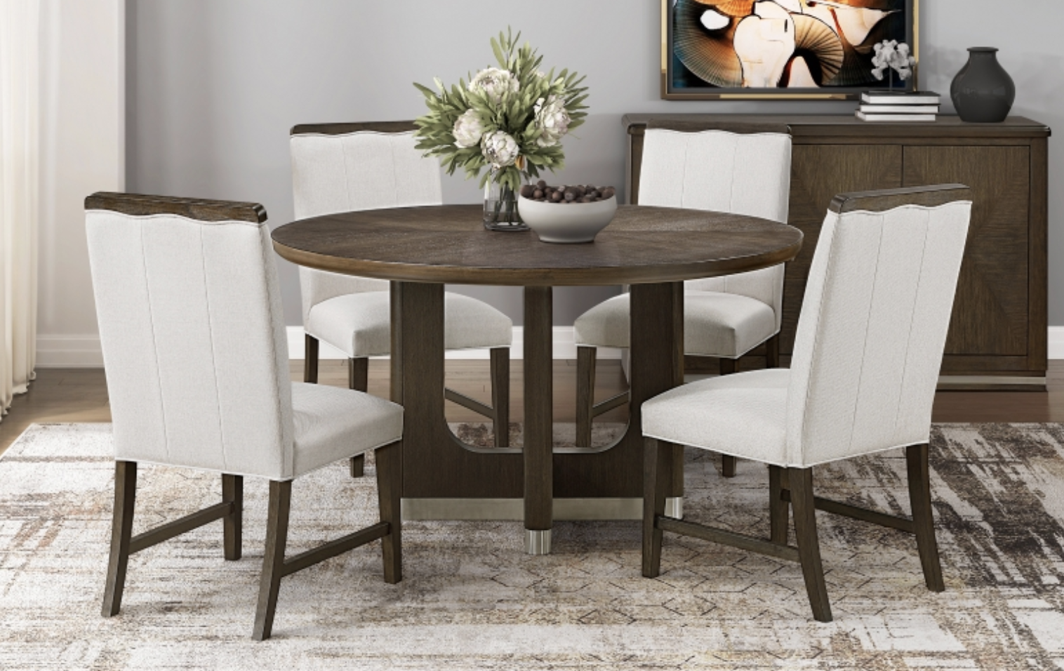 Elevate your dining space with this sophisticated modern collection, finished in a beautiful wire-brushed brown. The centerpiece is a stylish round dining table that comfortably seats four, featuring a durable oak veneer top and a unique base with subtle metallic accents. The coordinating dining chairs are upholstered in a textured fabric for comfort and built on a sturdy plywood frame. This collection is completed by a highly functional server with three cabinets, adjustable shelves, and elegant metallic handles. The entire set combines robust construction with a sophisticated aesthetic to create a cohesive and functional dining area.