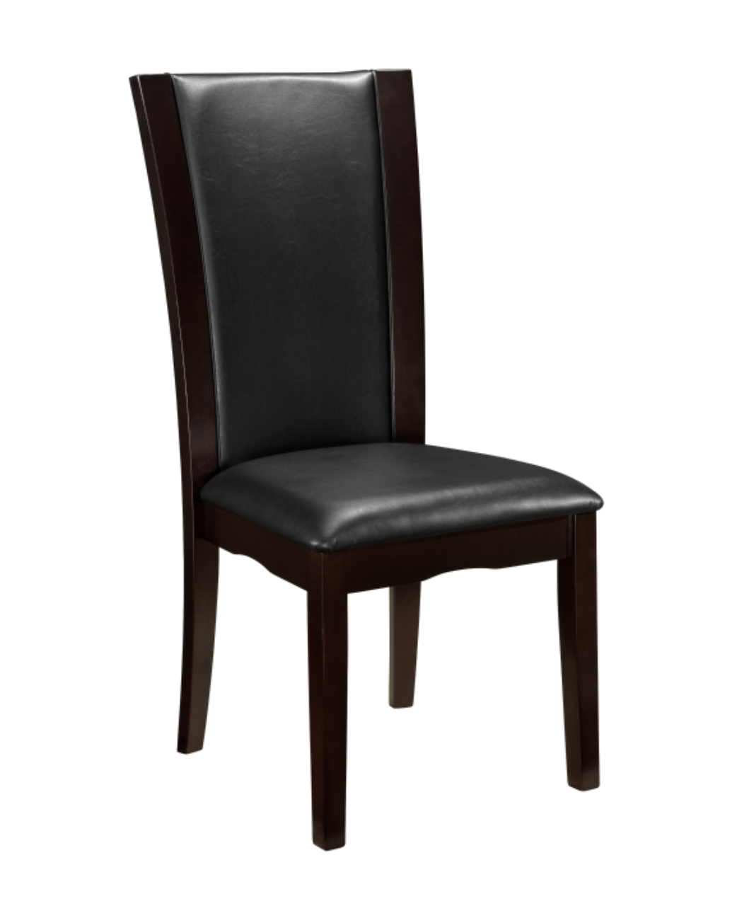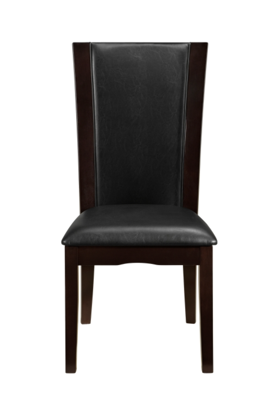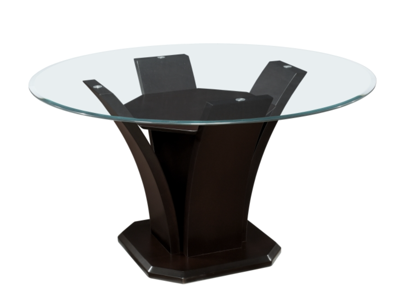 Daisy Collection combines superb visual appearance and fine quality that you need in your dining area. Three distinct elegant flared tulip bases support beveled glass tabletops on the rectangular and round traditional dining height tables. Additional offering is the trestle table with black glass insert. Dining height chairs feature clean lines and sleek curves; available in both white faux leather and dark brown faux leather. The set is constructed of hardwood solids and veneers in a refreshing espresso finish.
