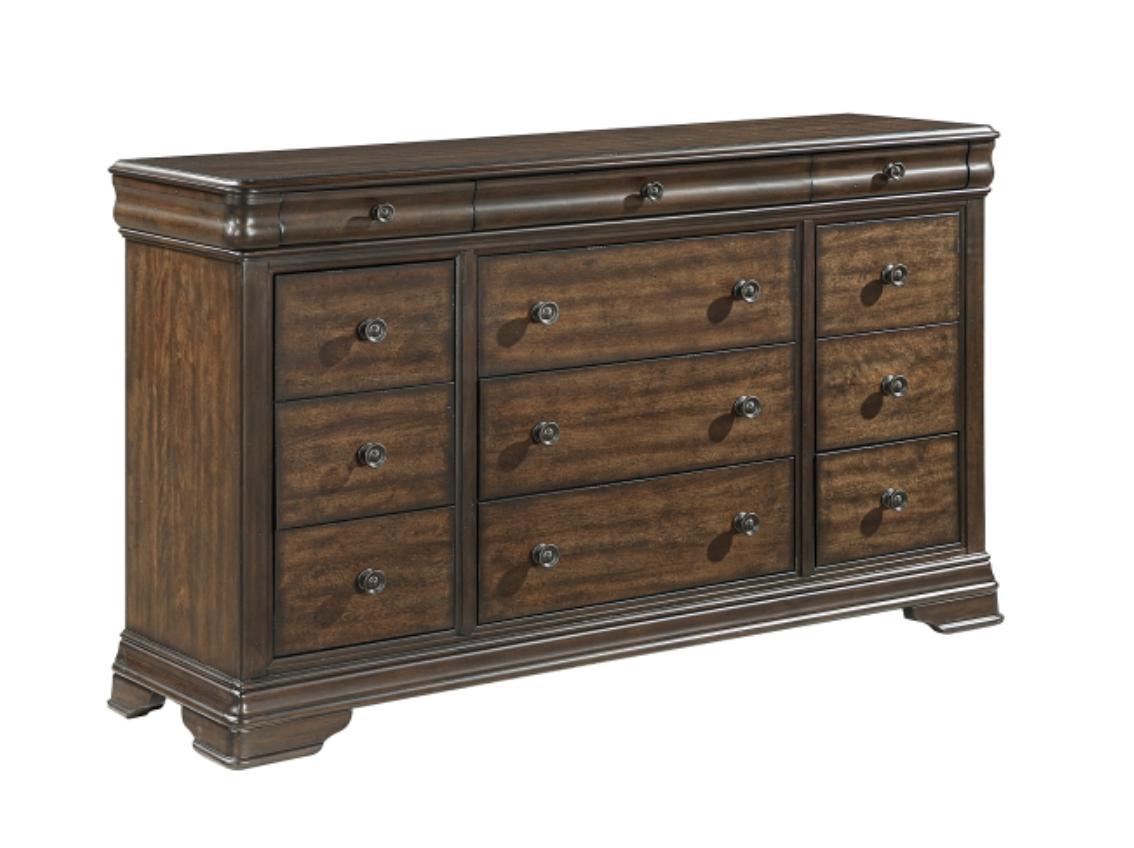 Elevate your bedroom with the understated luxury of the Richmond Bedroom Collection—a masterful blend of classic Louis Philippe design and contemporary craftsmanship. Thoughtfully constructed from solid pine and premium birch veneers, this collection is finished in a warm brown cherry that adds depth, richness, and a sense of comfort to any space. The centerpiece, a refined sleigh bed, features a gracefully curved headboard paired with a modern low-profile footboard—offering a fresh take on tradition that feels both grounded and current. For added versatility and an extra layer of softness, the collection also offers an alternative headboard option featuring a button-tufted, upholstered linen panel with a rolled top, beautifully framed by shaped solid wood pilasters. Each coordinating piece is designed for beauty and functionality: from the 12-drawer dresser with a beveled-edge mirror to the spacious five-drawer chest and the classic three-drawer nightstand, every element brings quiet luxury and refined storage to your bedroom sanctuary.