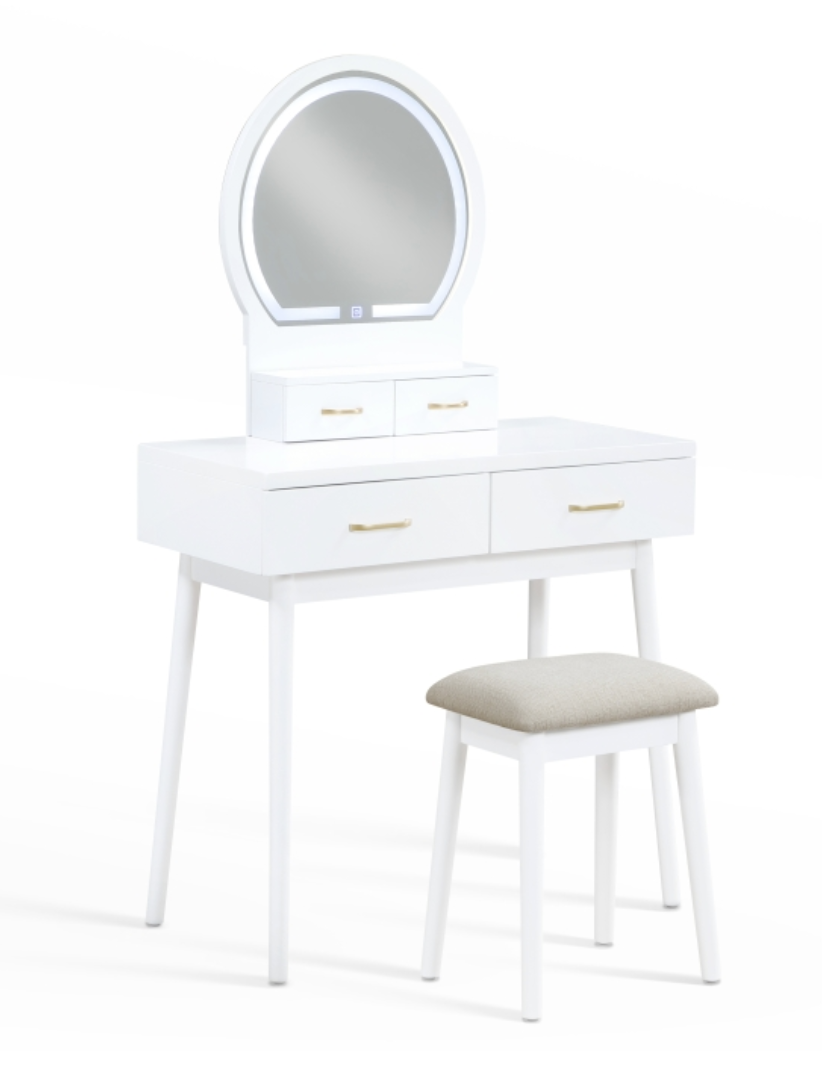 Transform your daily routine into a luxurious experience with the modern vanity set. This elegant vanity, crafted from durable wood and engineered wood with a crisp white finish, provides the perfect space for your beauty regimen. The integrated LED-lighted mirror, activated by a smart touch sensor, offers optimal illumination, while four smooth-gliding drawers with polished brass-tone bar pulls provide ample storage for all your cosmetics and accessories. Complete with a matching padded stool, this set combines sophisticated design with practical functionality, making it an ideal addition to any bedroom or dressing area.